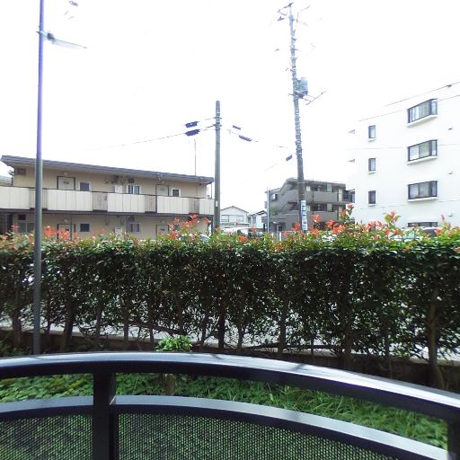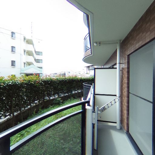 植栽越しで視線がやや遮られる(確度85%):バルコニー前面に生け垣があり、道路や向かいの建物からの直接的な視線はある程度和らいでいるように見える。