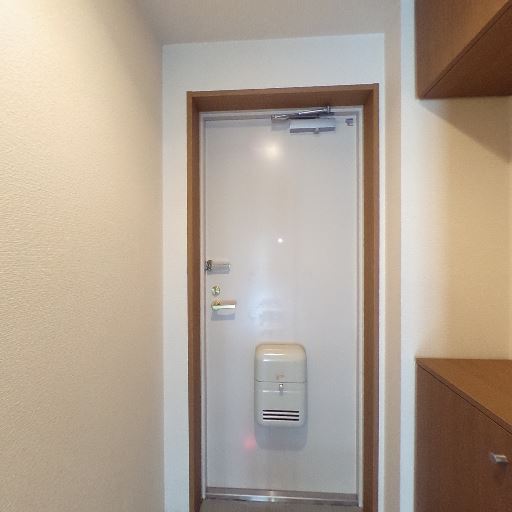 玄関収納が備わっている(確度94%):玄関脇に上下分かれた木製の収納棚があり、靴や小物を整理しやすい構成に見える。