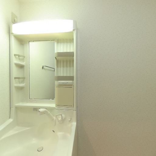 独立洗面台がある(確度95%):洗面ボウル・鏡・照明・収納棚が一体になった独立洗面台が設置されている。