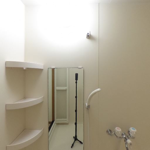 浴室内に鏡と棚があり使い勝手がよい(確度93%):洗い場側の壁面に縦長の鏡とコーナー棚が設置されており、洗面・整容用品を置きやすい構成になっている。