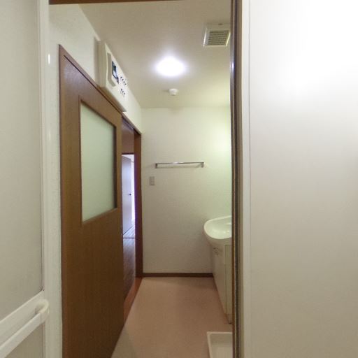 キッチンと洗面スペースが近い(確度78%):洗面脱衣所の出入口の先にキッチンが見えており、水回りが比較的まとまった配置になっている。