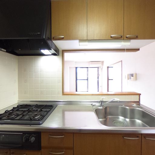 キッチン設備が一通り揃っている(確度94%):3口ガスコンロ、レンジフード、シンク、上部収納が確認でき、日常的な自炊に必要な設備は概ね整っている。