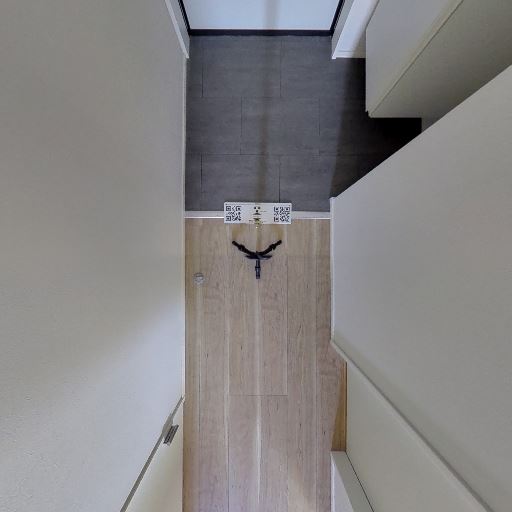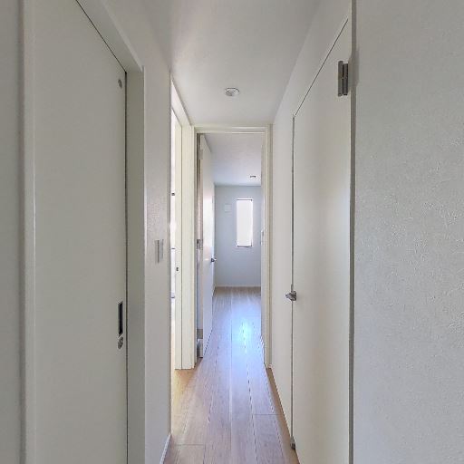廊下の収納が充実(確度82%):廊下右側に縦長のクローゼット扉が並び、左側にも引き戸の収納が見える。