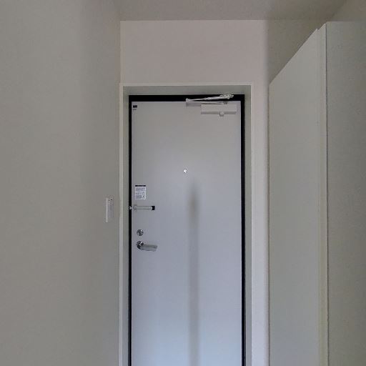 玄関ドアとドアチェーンあり(確度90%):玄関側の壁面に白い金属製の玄関ドアがあり、ドアクローザーとドアチェーンが確認できる。