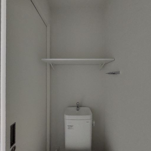 収納・棚がある(確度90%):便器上に浅めのオープン棚が1段設置されている。トイレットペーパー等の収納に使えそう。