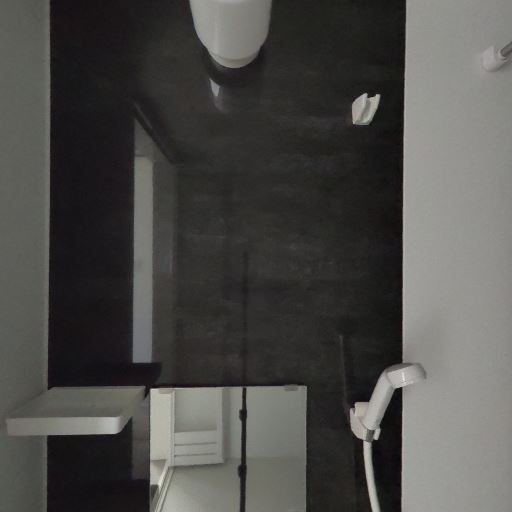 ユニットバスの清潔感(確度72%):白を基調に黒のアクセントパネルで新しめのユニットバス。大きな汚れや劣化は見当たらない。