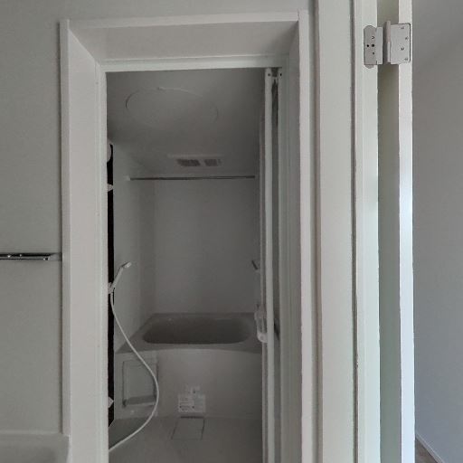 浴室が隣接(確度90%):洗面所から浴室へ直接入れるレイアウトで、シャワーと浴槽が見える。