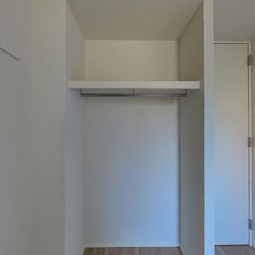 クローゼットの存在(確度90%):オープンタイプのクローゼットがあり、上部棚とハンガーパイプが設置されている。
