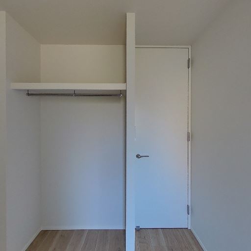 クローゼットと個室扉(確度90%):オープンタイプのハンガーパイプ付きクローゼットと室内扉が並ぶ。