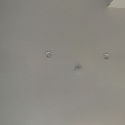 天井設備(ダウンライト/火災報知器)(確度78%):天井に丸型器具が複数あり、照明や検知器が設置されている。