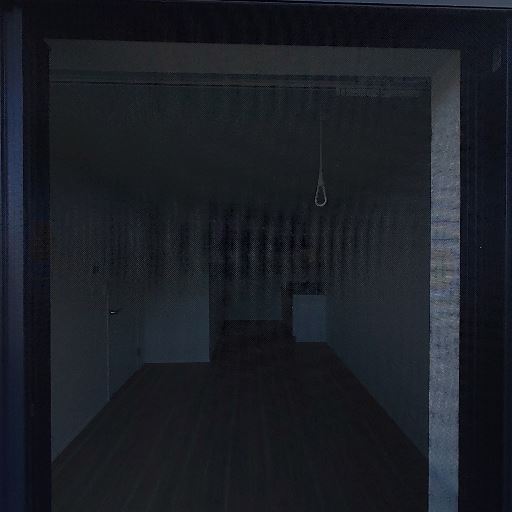 室内への採光(確度66%):ガラス戸が大きく、外は明るい環境。室内側は網戸越しで暗いが、日中は十分な光が入りそう。