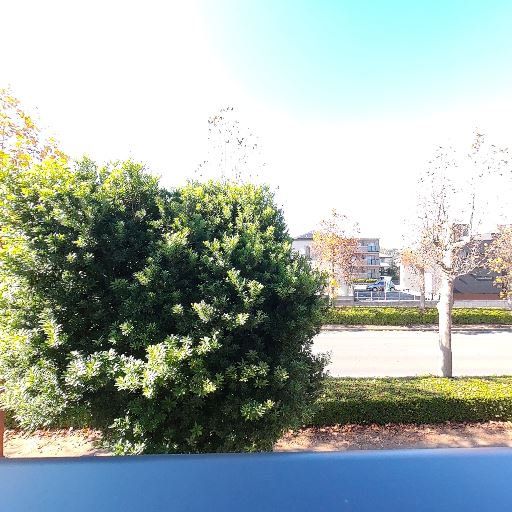 眺望と前面道路(確度80%):バルコニー正面は街路樹と車道で抜け感がある。向かい側の建物まで距離があり、圧迫感は少ない。