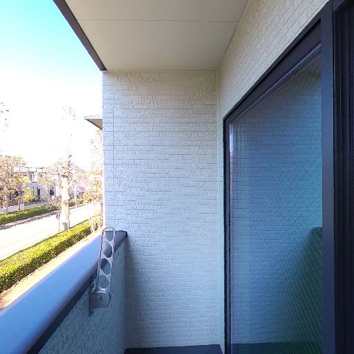 プライバシー(確度55%):道路と向かいの建物が視界に入り、視線はある程度通る可能性。手すりは通常の高さ。