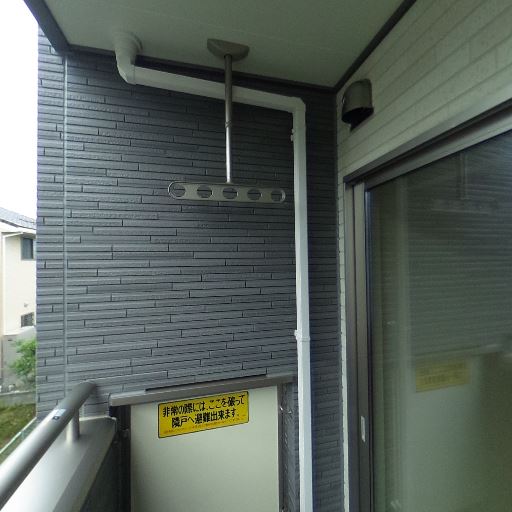 プライバシー面(確度69%):手すりは不透明パネルで室内側の目隠し効果がある一方、向かいの窓と向き合う配置で相互視線の可能性あり。