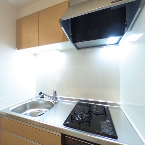 2口ガスコンロとレンジフード(確度83%):キッチンは2口コンロと整流板付きレンジフード、ステンレスシンクを確認。