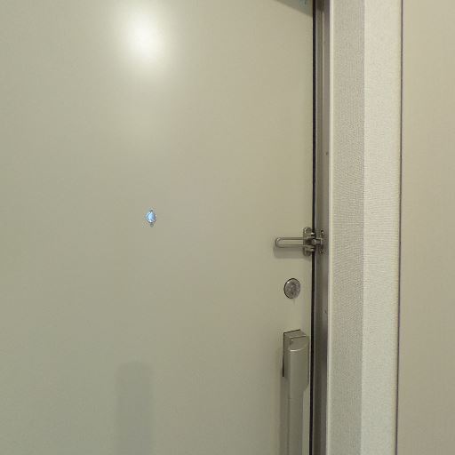 玄関ドアとセキュリティ(確度86%):玄関ドアにドアチェーン(ガードロック)と覗き穴があり、基本的な防犯機能が備わっている。