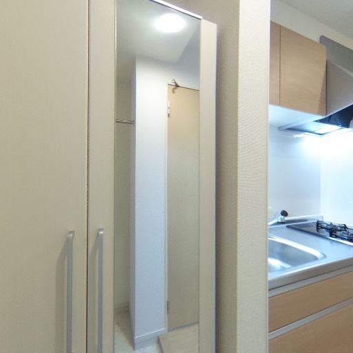 姿見付きシューズ収納(確度88%):玄関脇に天井付近までの収納と全身鏡が一体になった家具がある。