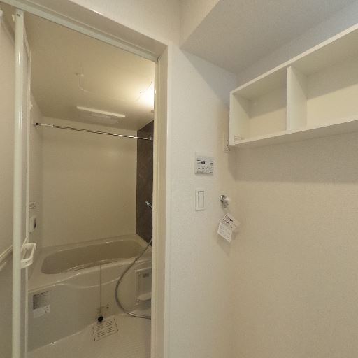 収納棚の備え付け(確度77%):脱衣所の壁にオープン棚があり、タオルや日用品を置ける。