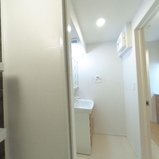 独立洗面台あり(確度86%):鏡付きの独立洗面台が設置されており、収納スペースも確認できる。