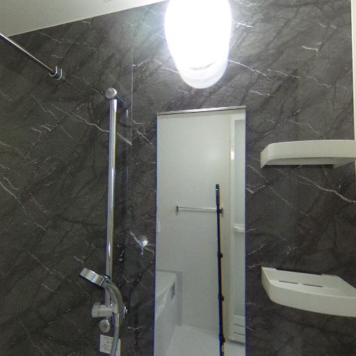 シャワー・収納棚付きの壁面(確度86%):ダーク調の石目パネルに可動式シャワーとコーナーシェルフが2段。