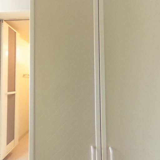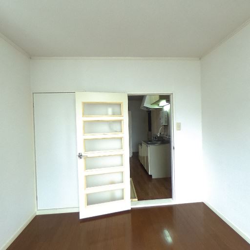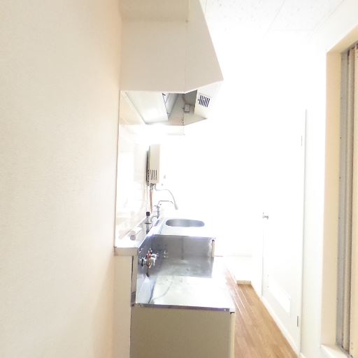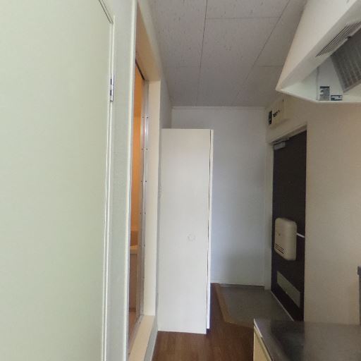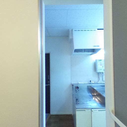 キッチンと居室が隣接(確度76%):室内ドアの先にキッチンが見える間取りで、ワンルームまたは1Kの構成と推測。