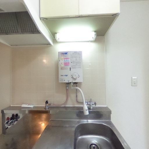 キッチン設備の状態(確度78%):ステンレスの流し台とガス台、上部に給湯器と蛍光灯があり、全体的に清掃されていて使用感はあるが大きな損傷は見えない。