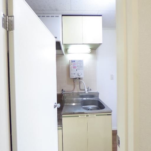 コンパクトなキッチン付き(確度80%):トイレ前の扉の先に1口シンク・壁付け給湯器・吊戸棚がある小型キッチンが見える。