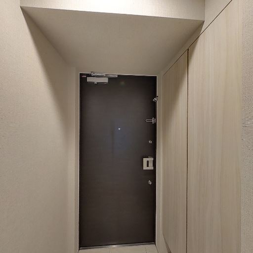 • 玄関ドアと収納の配置(確度80%):黒系の玄関ドア正面、右側に天井までの大型収納扉が並ぶ。通路幅はややタイトだが動線はシンプル。