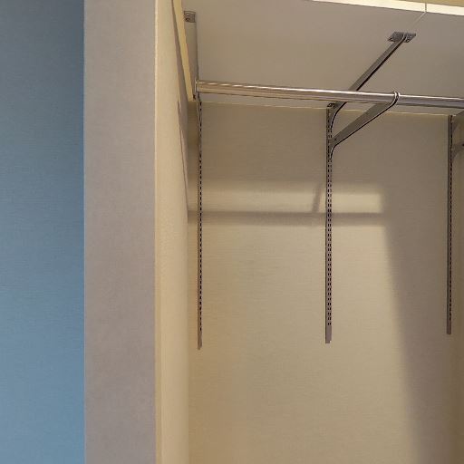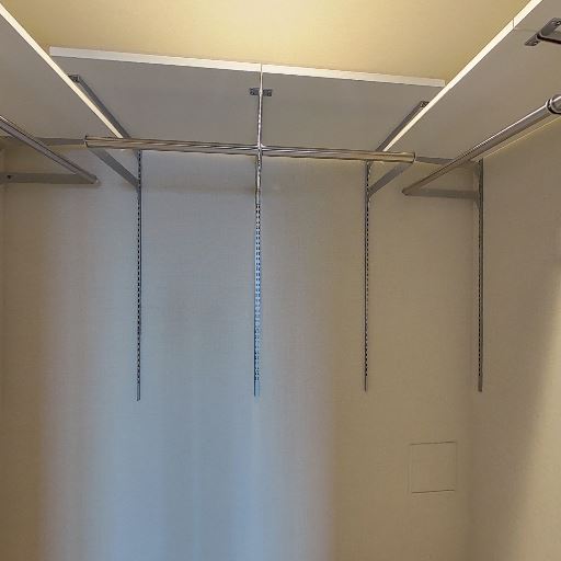 • ウォークインクローゼットの収納力(確度82%):三方向にハンガーパイプが設置され、可動ブラケットで高さ調整ができそう。吊り下げ収納に向いている。