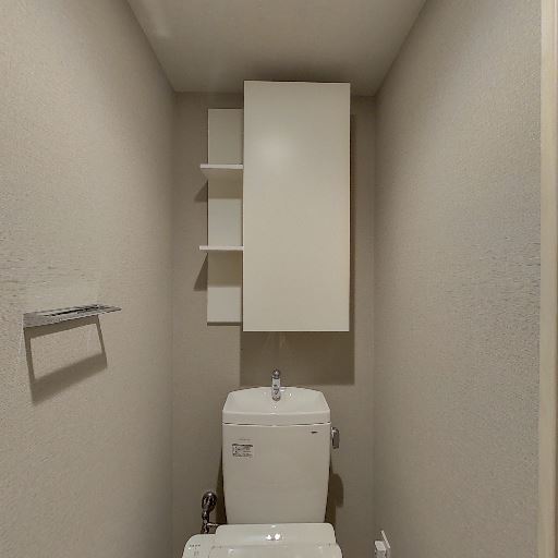 • 収納が充実したトイレ(確度86%):便器正面の上部に扉付きのキャビネットとオープン棚があり、トイレットペーパーや掃除用品をしまえる。