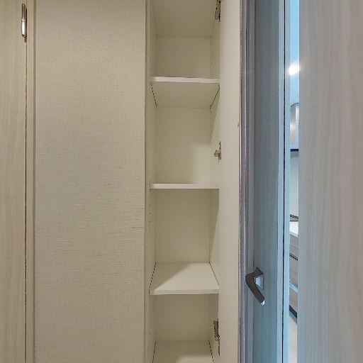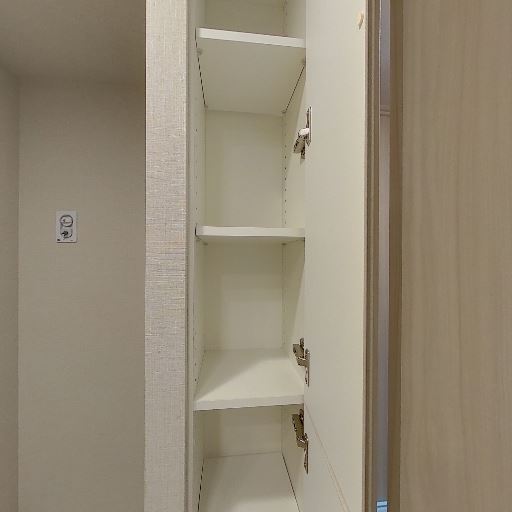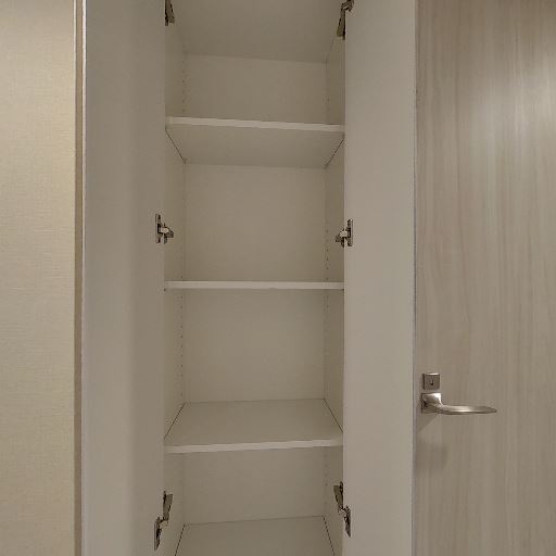 • 廊下収納(可動棚)(確度86%):廊下に扉付きの縦長収納があり、内部は複数段の棚で小物や日用品の整理がしやすそう。