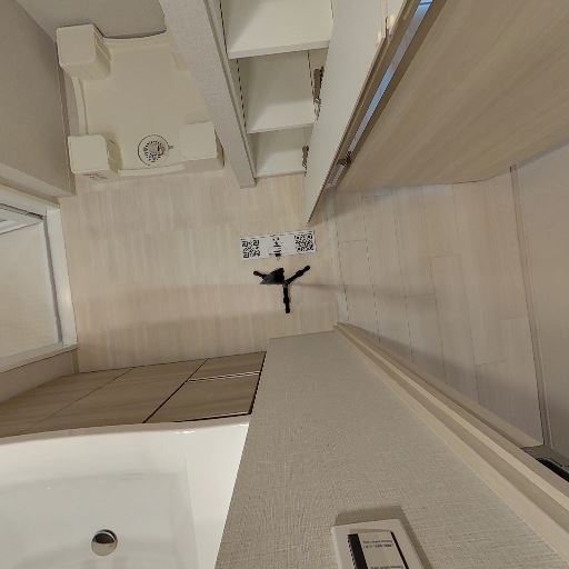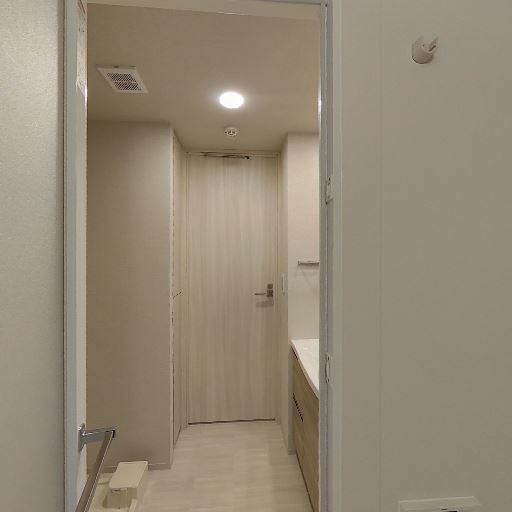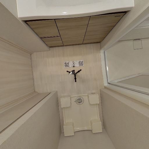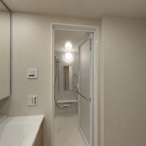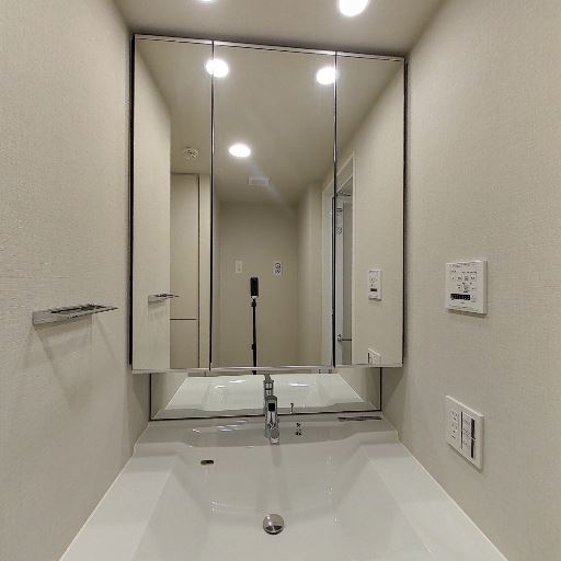 • 洗面室であること(確度90%):洗面台・鏡面収納、奥に浴室入口が見える。床には洗濯機置き場も確認できる。