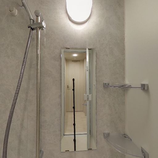 • 浴室の設備(確度74%):浴室内に鏡・シャワー・棚・換気扇が見える。