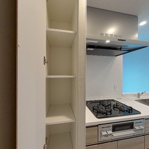 • 収納の充実(確度82%):背の高い可動棚のパントリー収納があり、扉付きで中が隠せる。キッチン下部収納も引き出しタイプ。