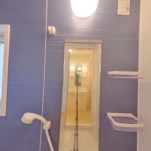 浴室が隣接し動線良好(確度80%):洗面室のすぐ横に浴室入口。浴室内は青いアクセントパネルと棚が確認できる。