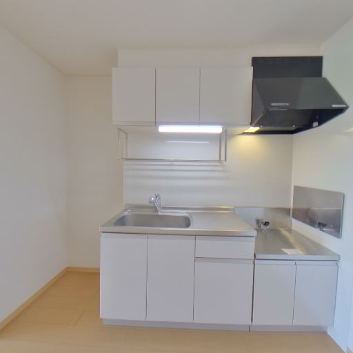 キッチン設備の状態(確度86%):ステンレス天板のシンクとコンロスペース、上部・下部収納、レンジフードが設置されており清潔感がある。手元灯も確認できる。