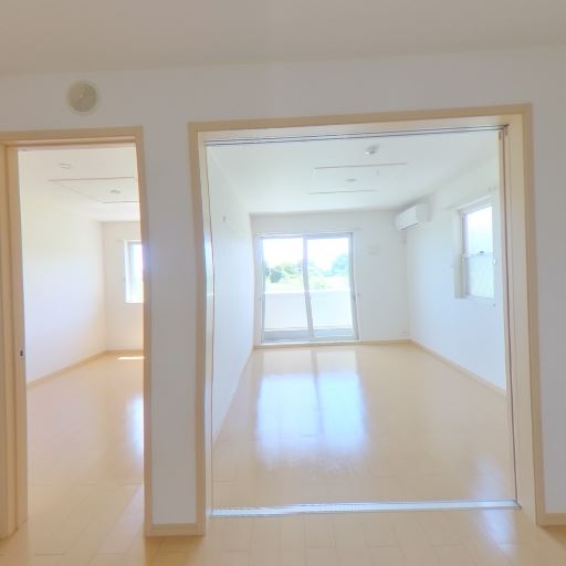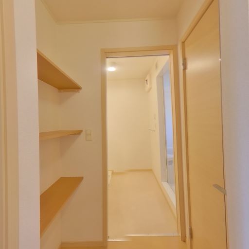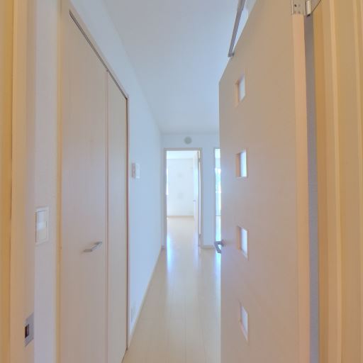 廊下の奥行きと回遊性(確度70%):玄関から廊下が伸び、奥に居室が見通せる。途中に引き戸(または開き戸)と物入れの扉が並ぶ。