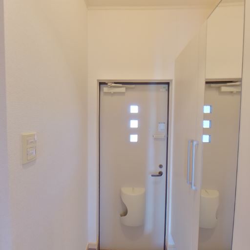 玄関に姿見付きの大容量シューズ収納(確度83%):玄関ドア脇に床から天井付近まである収納扉と、その表面がミラーになっている収納が見える。