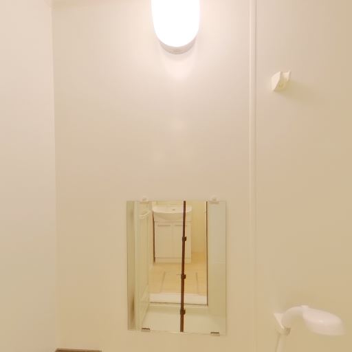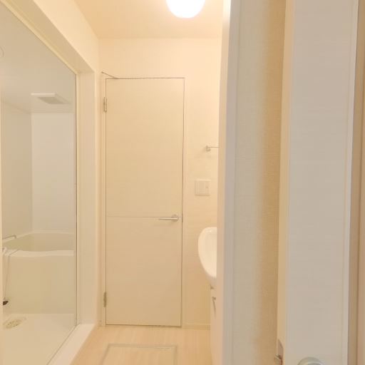 鏡の位置とサイズ(確度78%):浴室内の壁に中サイズの鏡があり、洗面側にも鏡付きの独立洗面台がある。