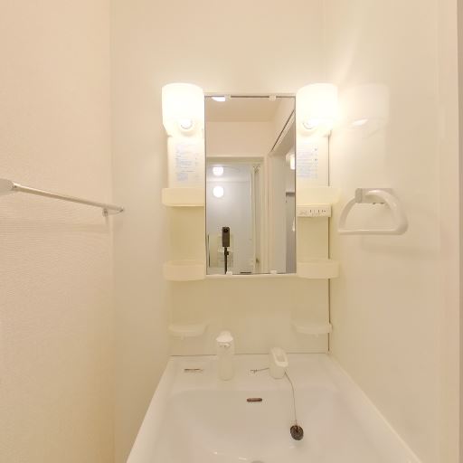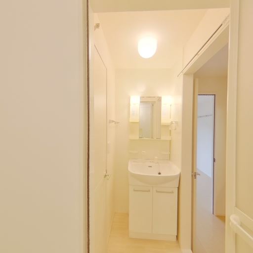 独立洗面台と収納付き(確度86%):照明一体型ミラーの独立洗面台があり、左右に小物棚と下部収納が見える。
