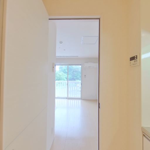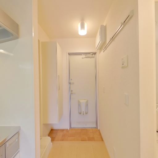 玄関と廊下の明るさ(確度78%):天井照明があり、白基調の内装で玄関〜廊下が明るく見える。