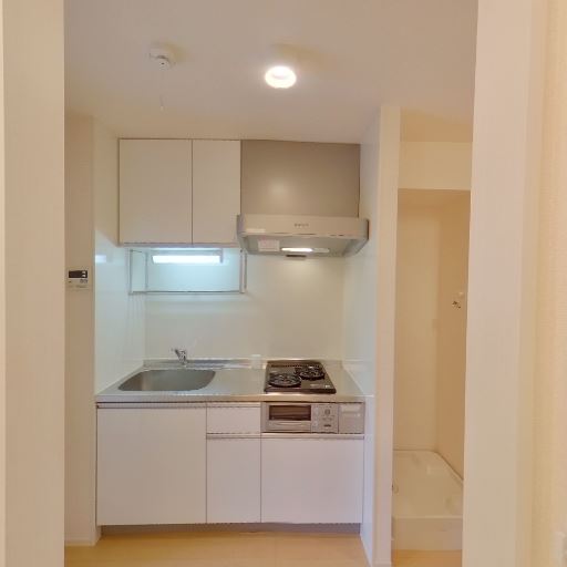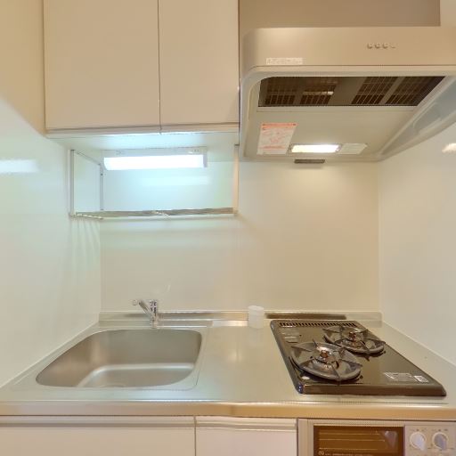 キッチン設備(確度82%):2口ガスコンロとシンク、上部レンジフード・吊戸棚が確認でき、作業スペースはコンパクトながら実用的。