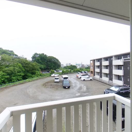 バルコニーと眺望(確度82%):手すり付きのバルコニーがあり、前面は駐車場と緑地で抜けがある。圧迫感は少ない。