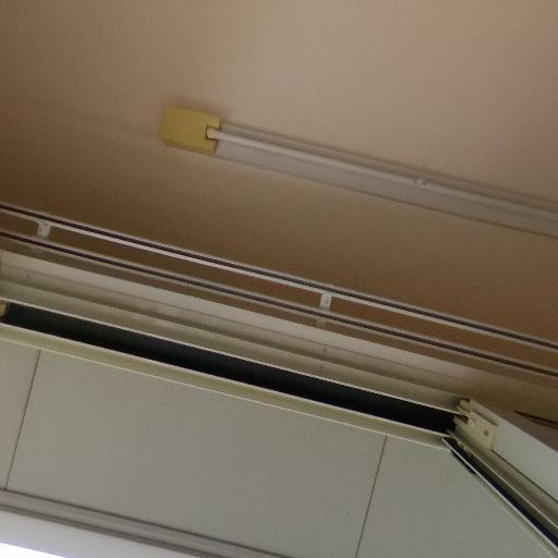 室内物干しレール・照明器具(確度69%):天井付近に室内物干しレールと蛍光灯器具が見える。