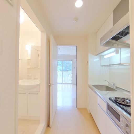 手洗い・洗面スペースが近接(確度74%):個室の外側に洗面台とキッチンが見える配置で、動線が近い。