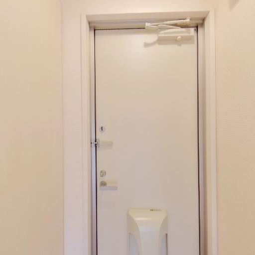 玄関ドアと設備の状態(確度78%):玄関ドアは内開きでドアクローザーや複数ロック、ポスト口・ドアスコープが確認でき、比較的きれいな印象。ドア下部には室内側の簡易靴収納/傘立てスペースは小さめ。