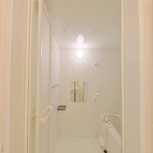 浴室はユニットタイプで清潔感あり(確度78%):白基調のユニットバス。鏡と棚、手すり、シャワー・浴槽が確認できる。