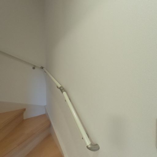 • 階段と手すり(確度86%):緩やかな折れ階段があり連続手すりが設置されている。角部にも手すりが続いていて上り下りしやすそう。