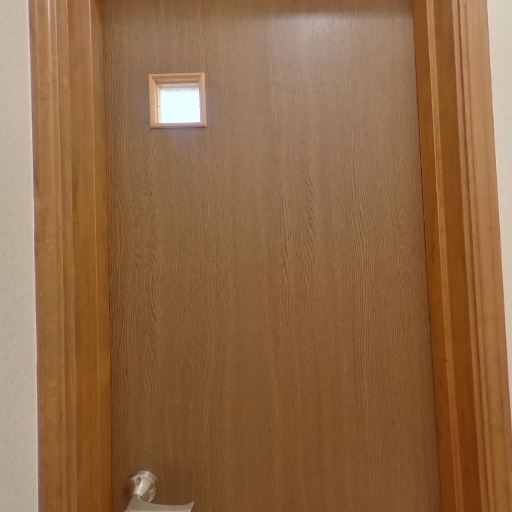 • トイレ個室の設備構成(確度90%):手洗い一体型タンクの洋式便器、紙巻器、タオルバー、換気扇、天井照明、小窓付き木製ドアが確認できる。