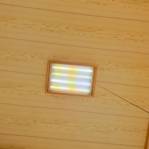 • 照明器具は天井埋め込みの蛍光灯タイプ(確度74%):木目天井の中央に角型の蛍光灯器具が設置されている。やや古めのタイプに見える。